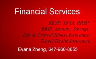 Evana Zheng is a Financial Advisor, providing services for RESP, TFSA, RRSP, RRIF, Annuity, Savings, Life Insurance, Critical Illness Insurance, Travel/Health Insurance. Please call Evana at 647-968-8655 for any finance and insurance inquiries.